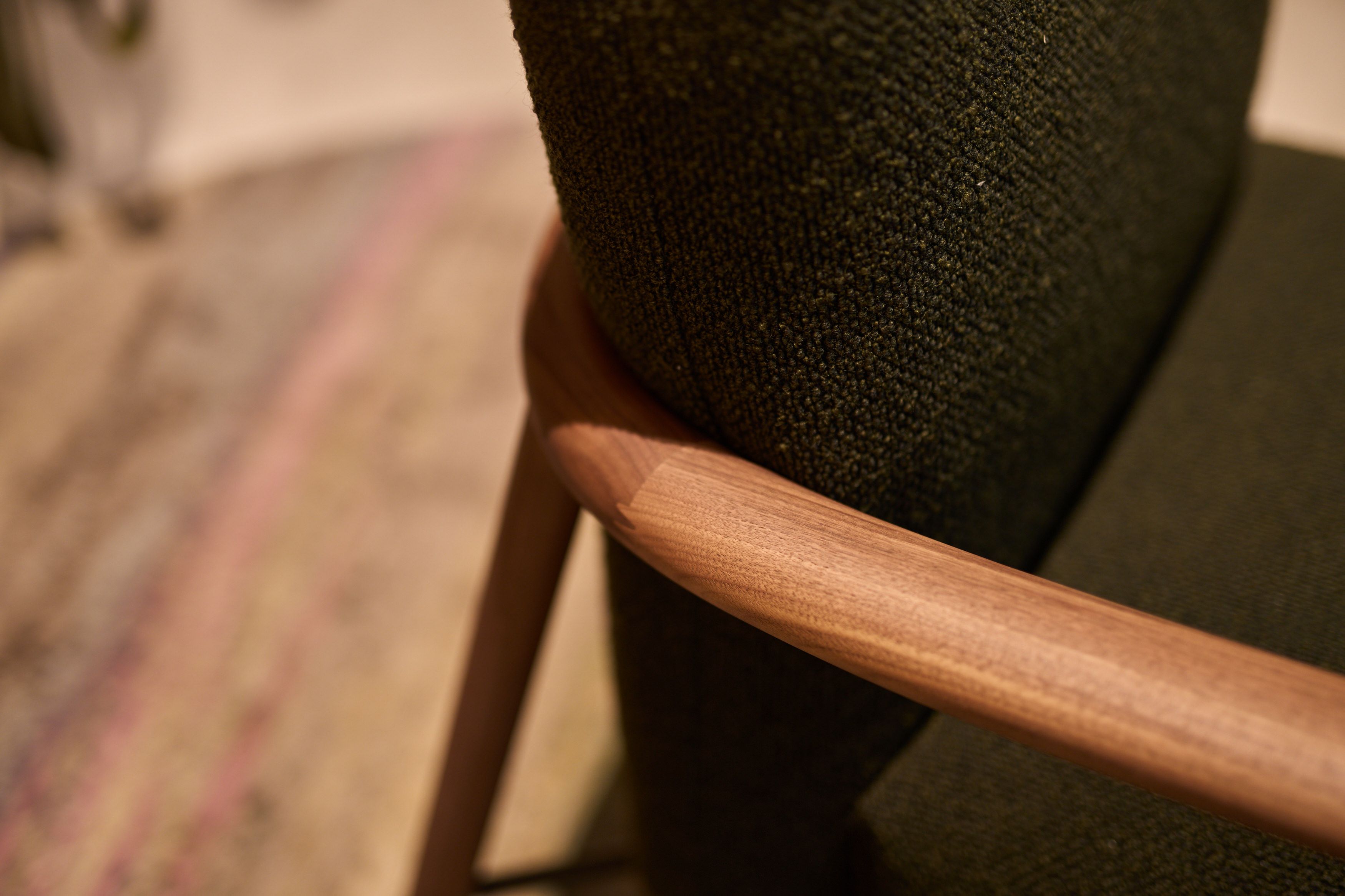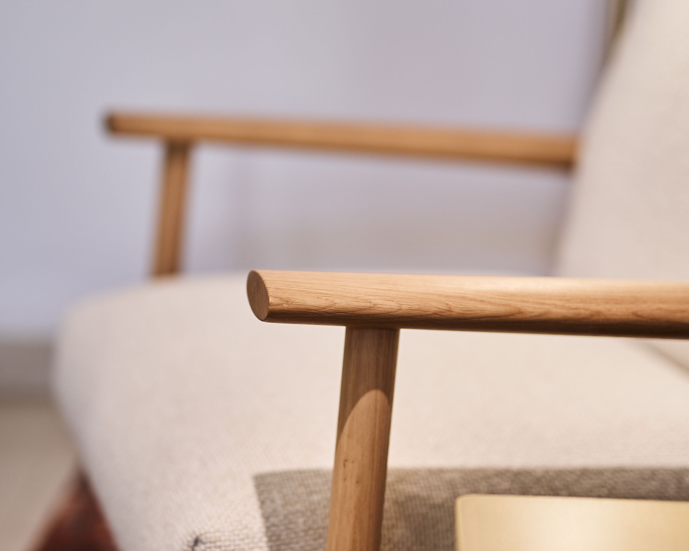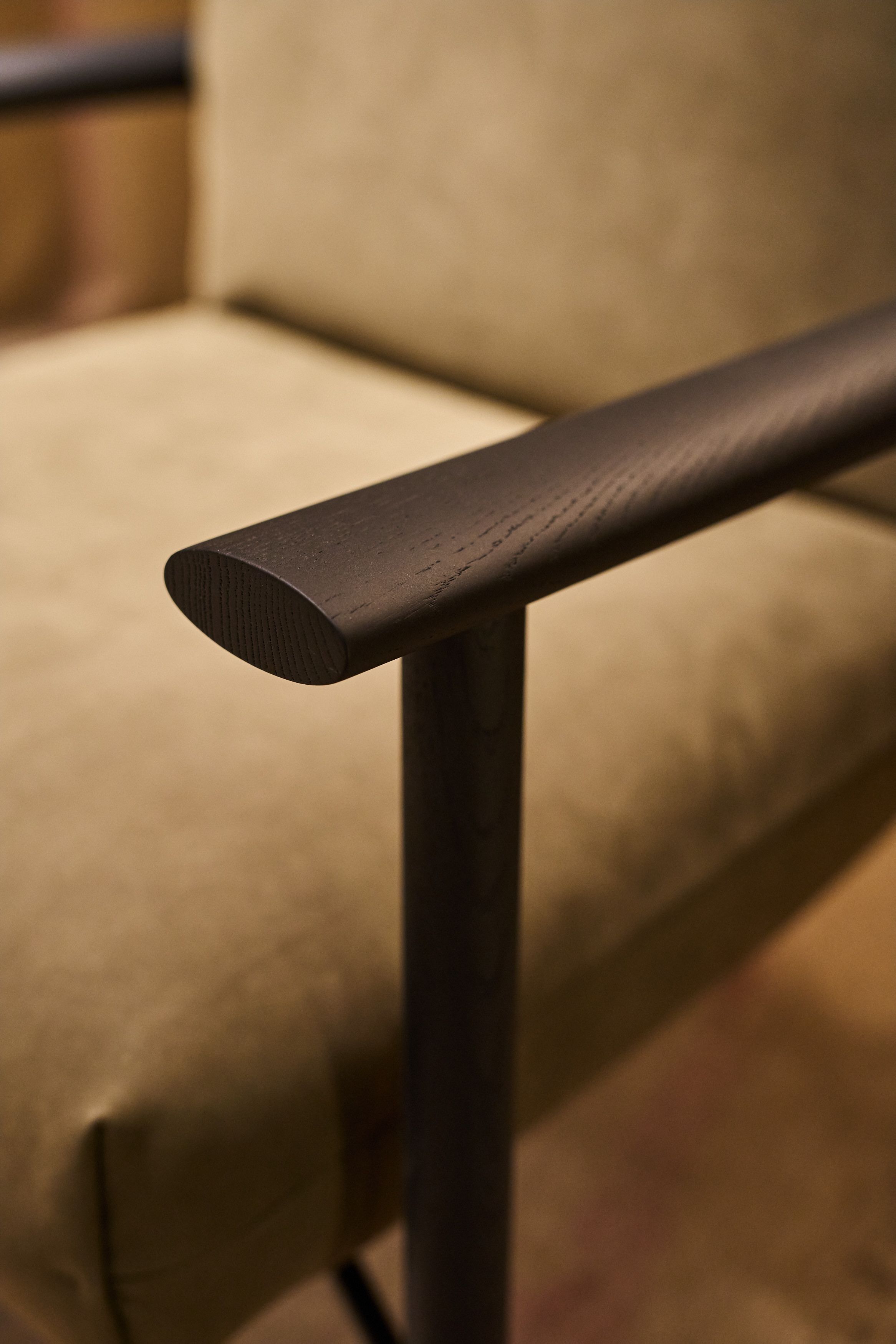 With Samay, the craftsmanship is evident in the way the armrests and backrest elegantly curve around the upholstery. The armrests extend forwards from the curved piece of wood in a paddle-like shape. Your arms rest comfortably on them.