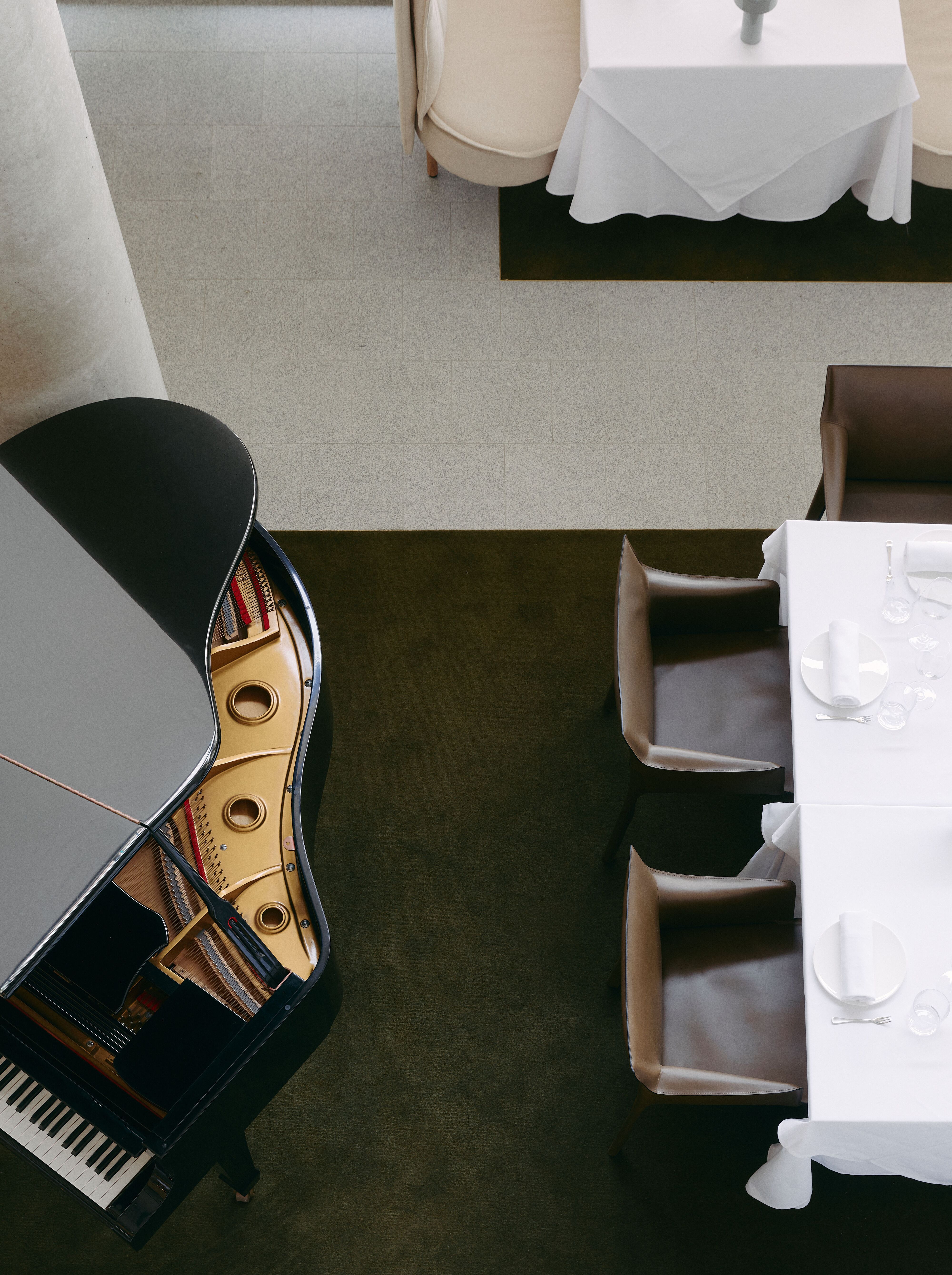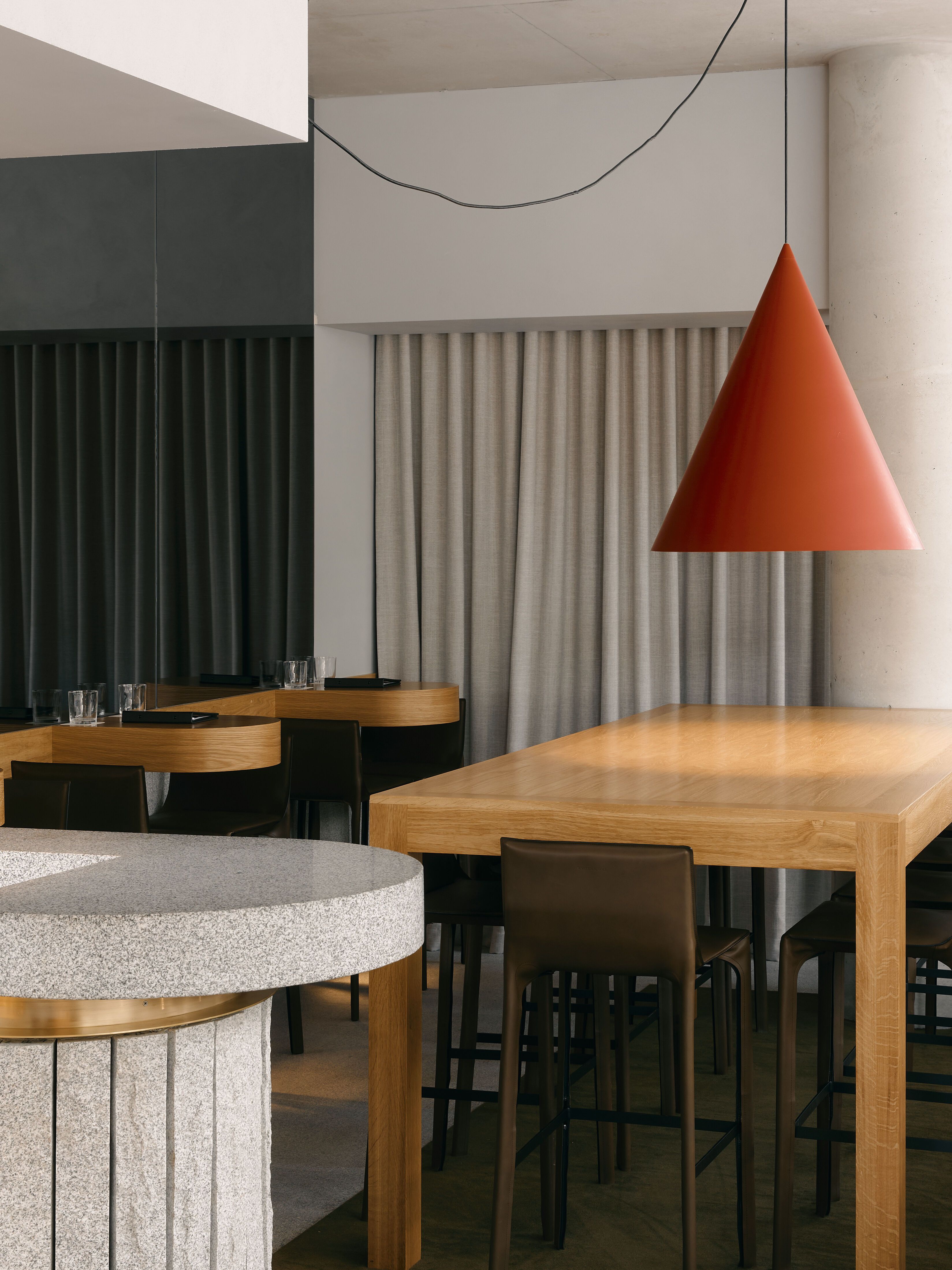 At the heart of this interior is the Saddle Chair. Crafted from supple saddle leather, its seamless surfaces envelop the frame in flowing lines. The edges are polished with care, seams are accurately finished executed, and the firm upholstery offers an astounding sense of comfort. Designed for dining, the chair promotes the rhythm of the restaurant – inviting guests to settle in, stay longer, and experience a place at ease.